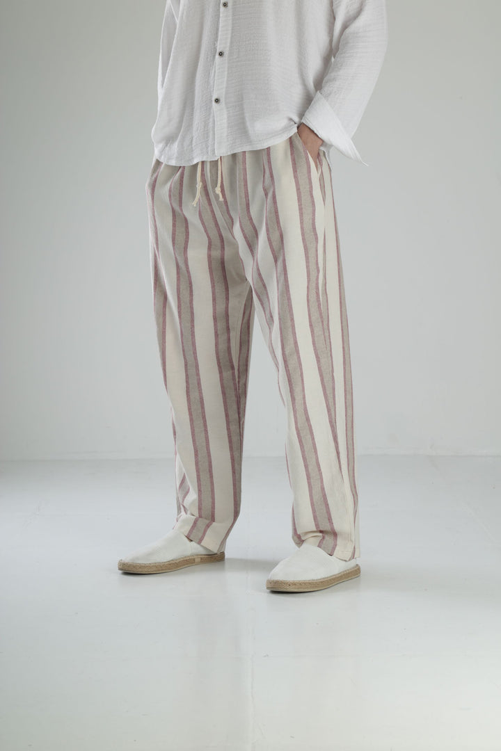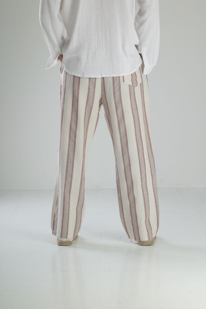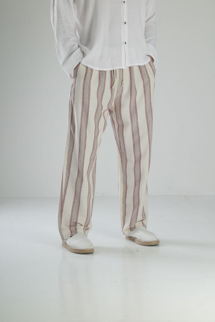 Bordo Çizgili Keten Pantolon