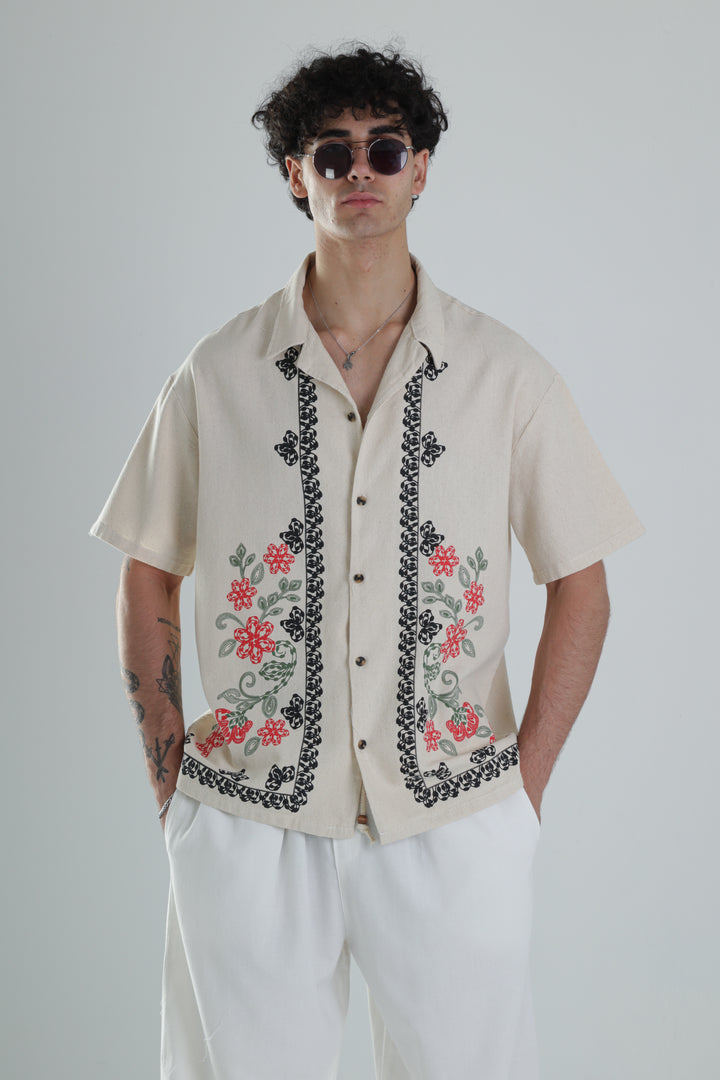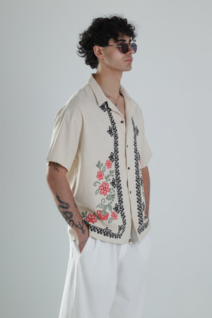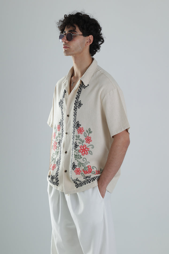 Çiçek Desenli Keten Tasarım Gömlek COC1355