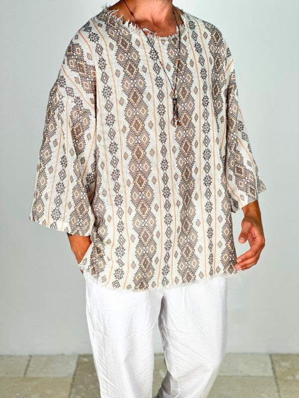 Çizgili Desenli Bohem Fakir Kol T-Shirt