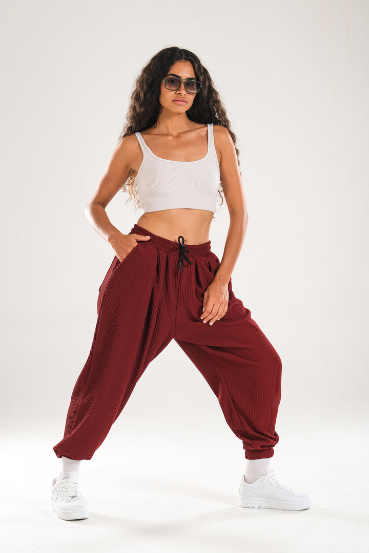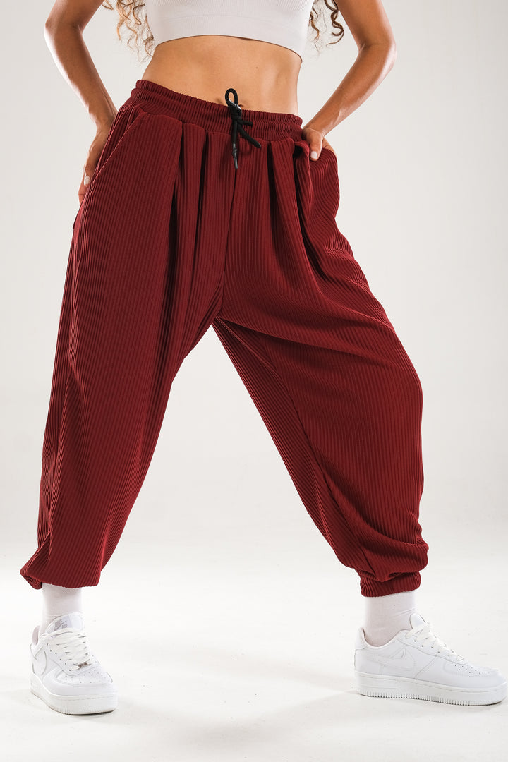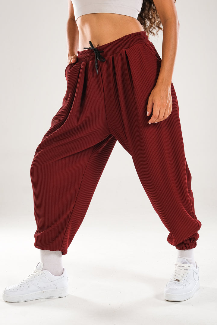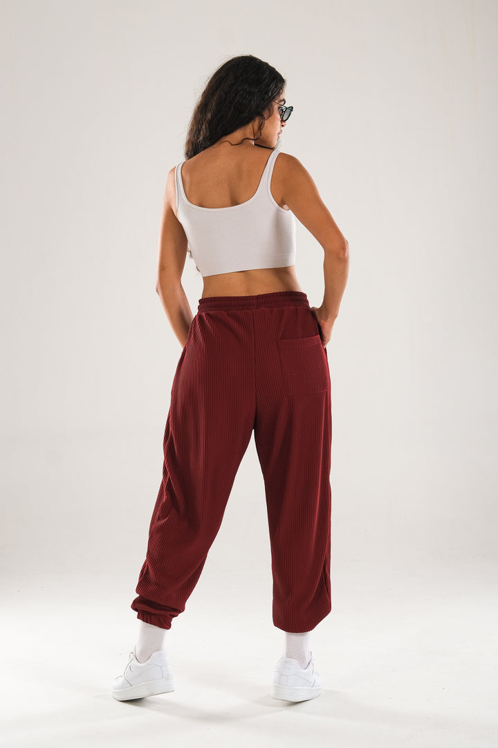 Fit & Beden Bilgisi: Pileli jogger kesimiyle sportif bir şıklık sunar. Fitilli dokusu ve bordo rengiyle modern bir görünüm kazandırırken rahat kalıbıyla gün boyu konfor sağlar.