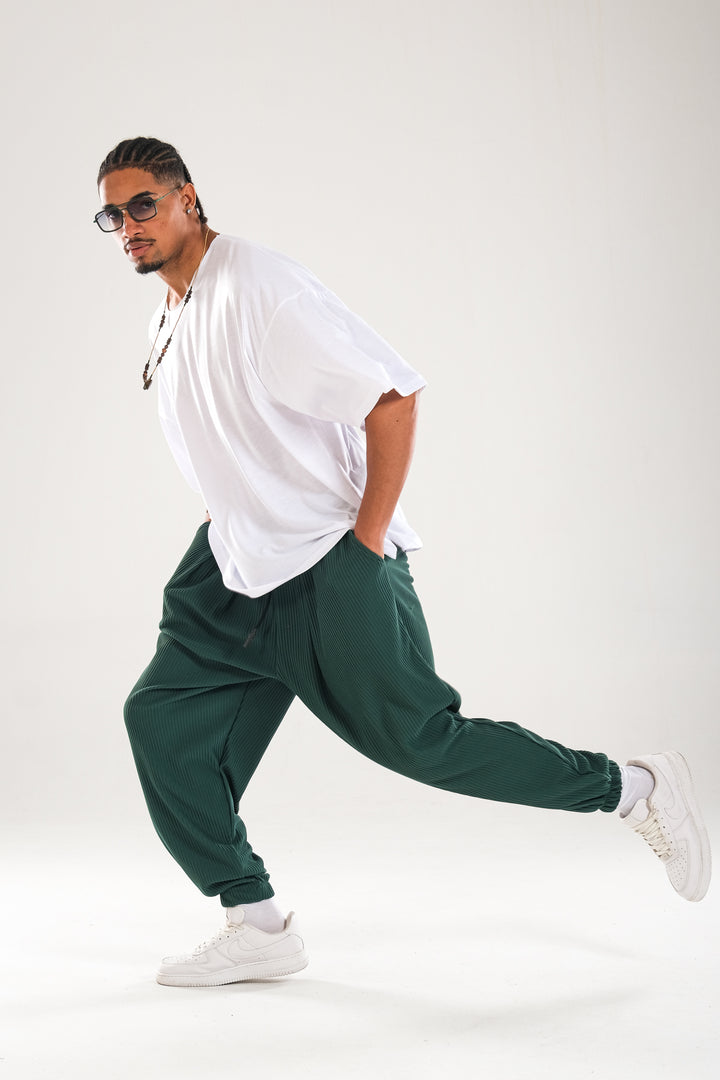 Fit & Beden Bilgisi: Pileli şalvar kesimiyle özgün ve modern bir tarz sunar. Fitilli dokusu ve yeşil rengiyle dikkat çekici bir görünüm sağlarken rahat kalıbıyla gün boyu konfor sunar.