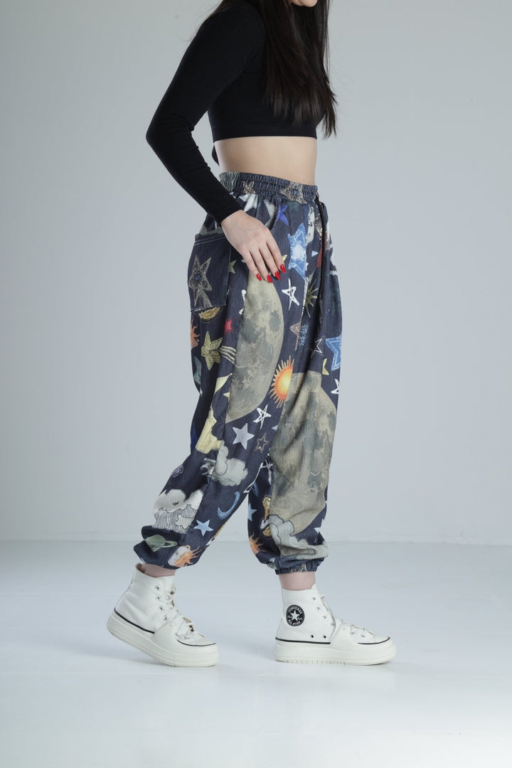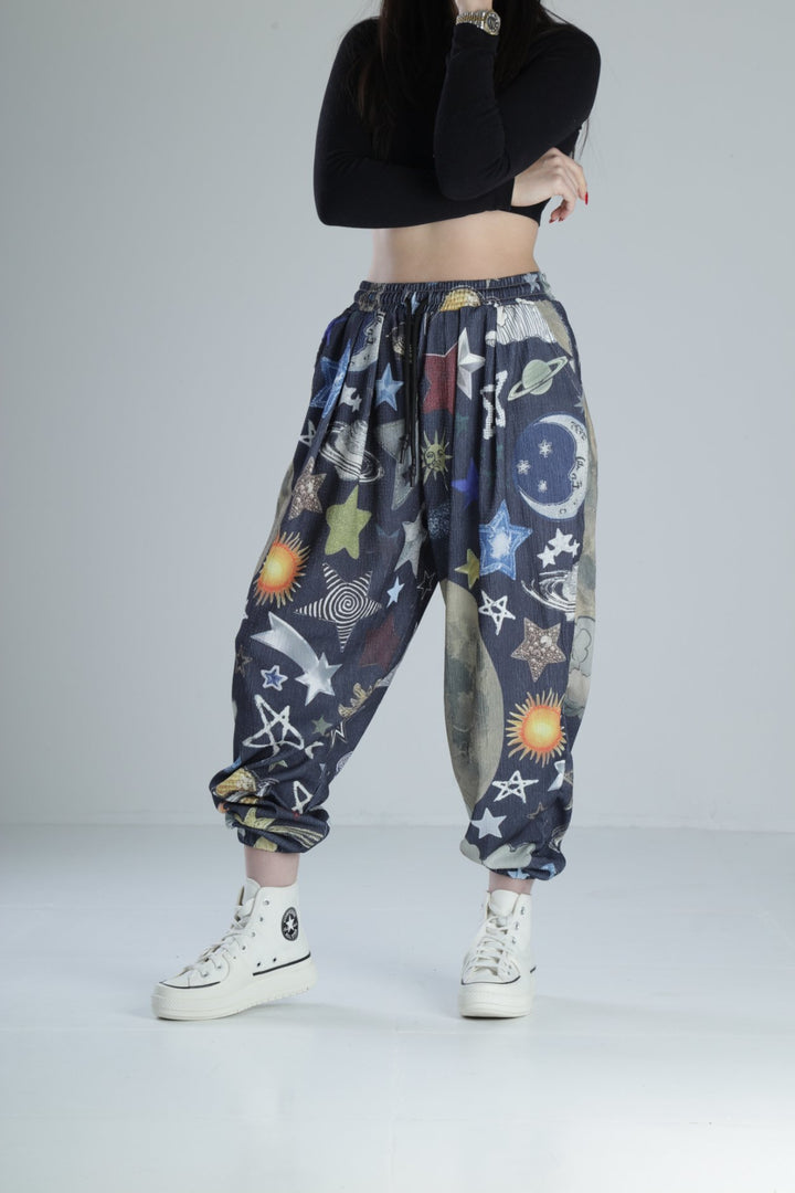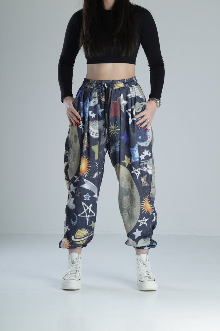 Gezegen Detaylı Pileli Bürümcük Kumaş Yarım Şalvar