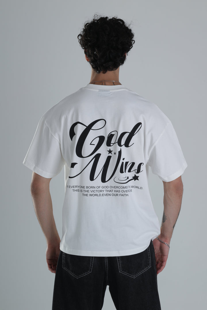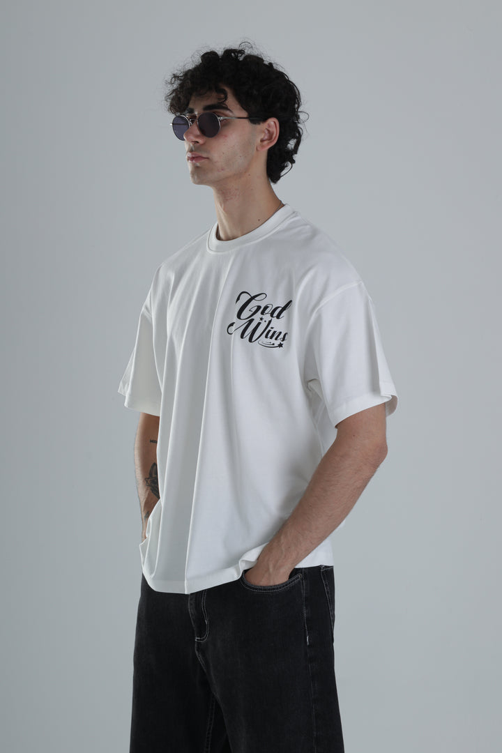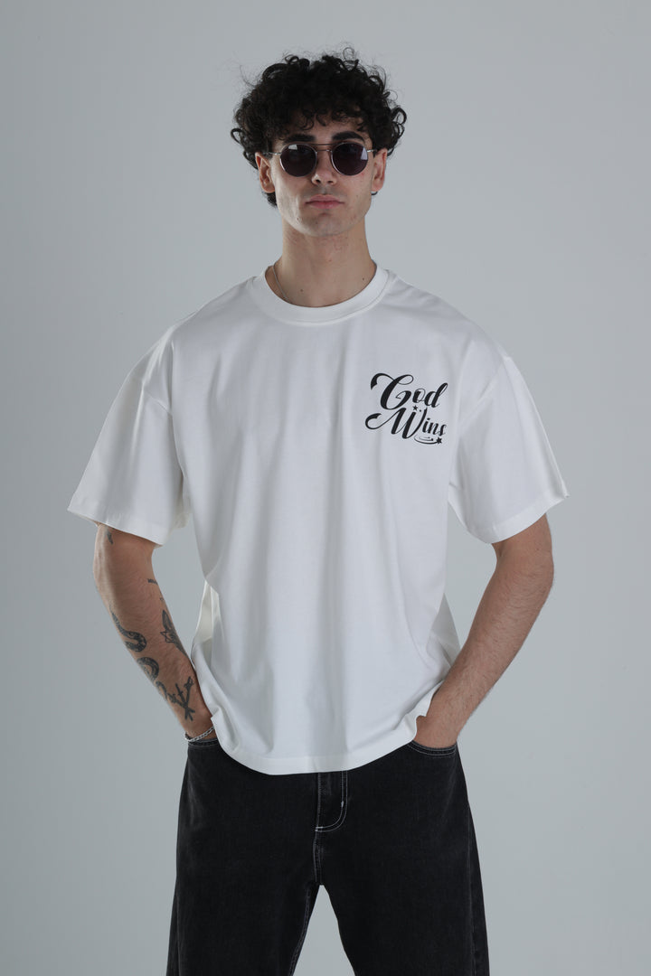 God Wins Beyaz Oversize Tasarım T-Shirt