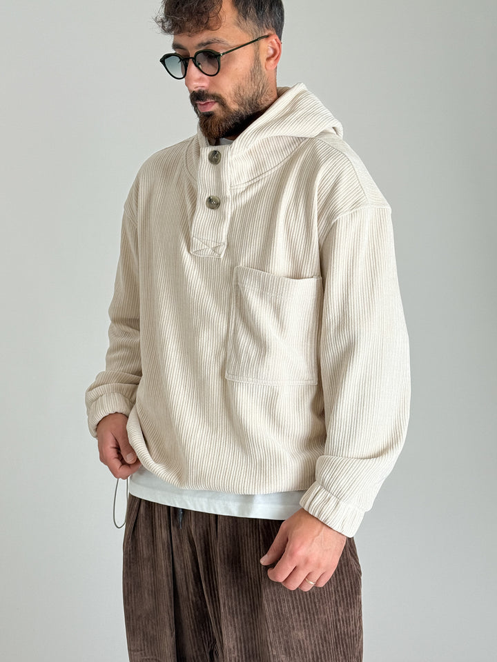 Kadife Dokulu Bej Oversize Kapüşonlu Erkek Sweatshirt