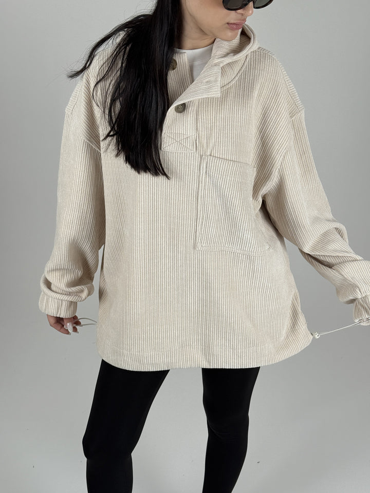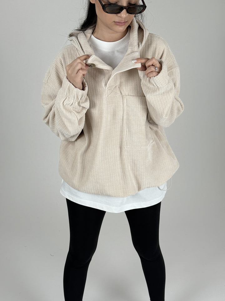 Kadife Dokulu Bej Oversize Kapüşonlu Kadın Sweatshirt COC1089