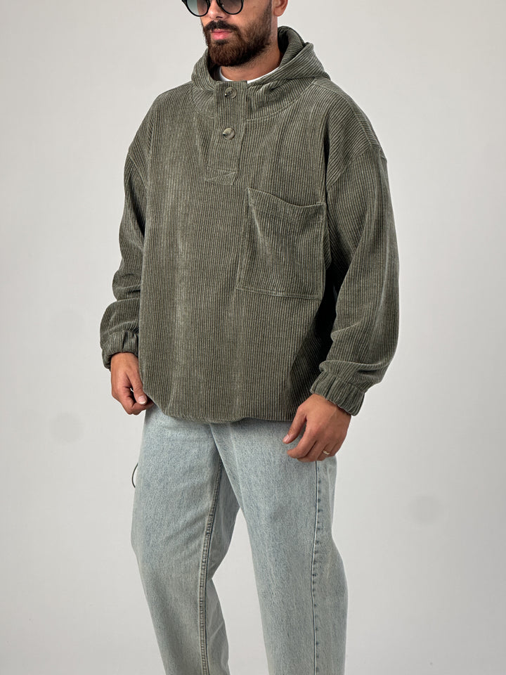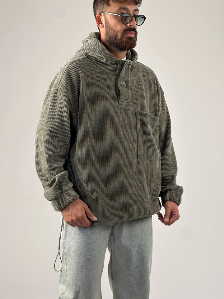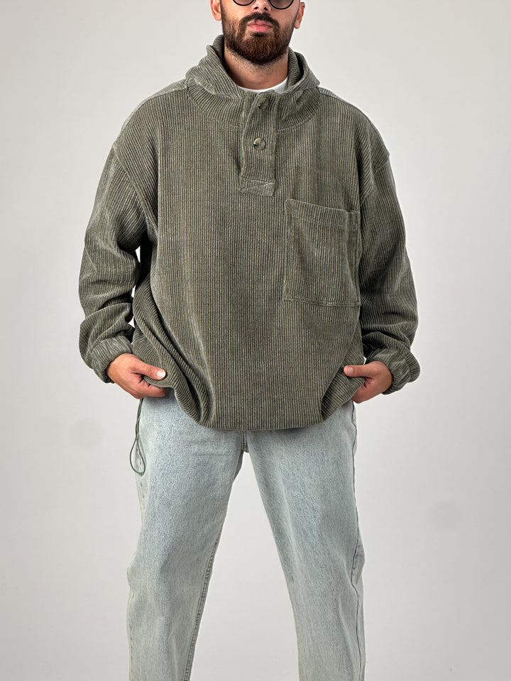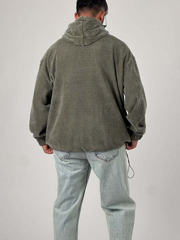 Kadife Dokulu Haki Oversize Kapüşonlu Erkek Sweatshirt