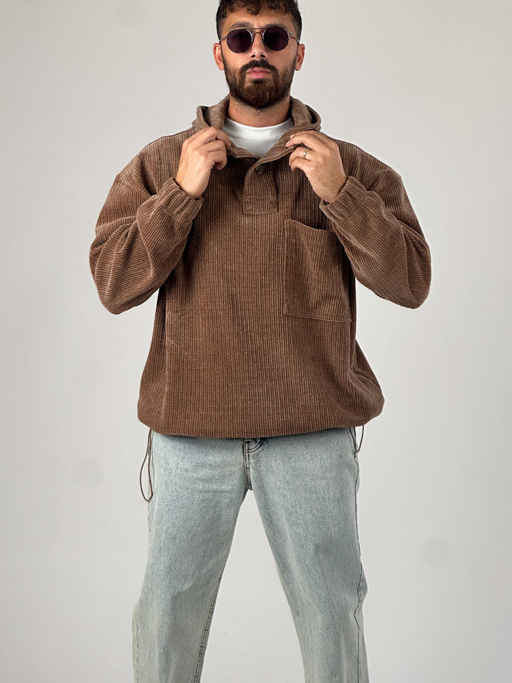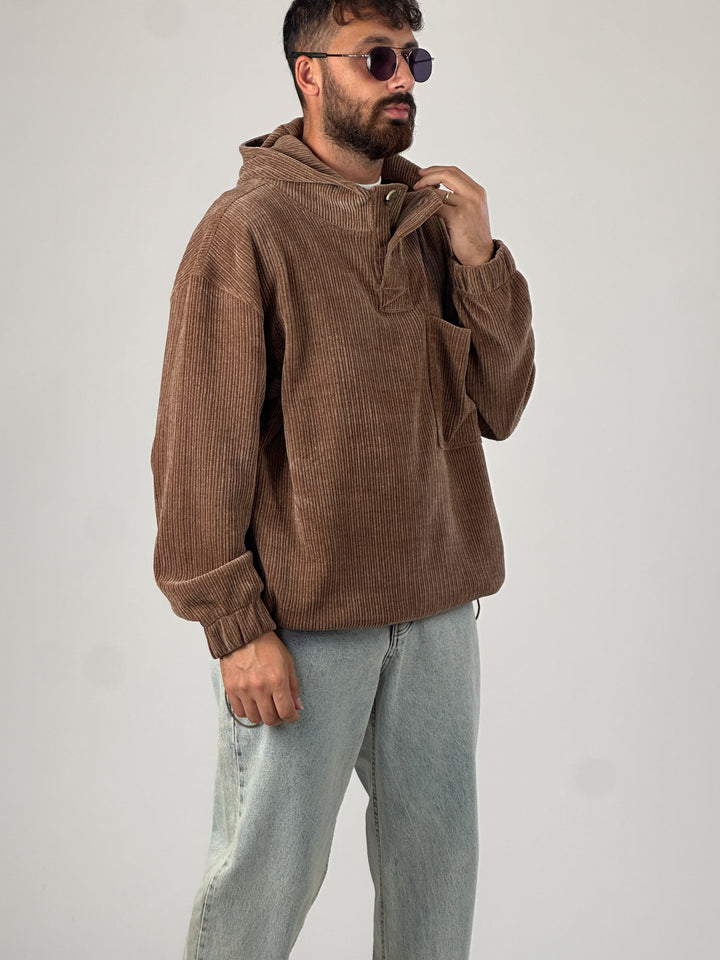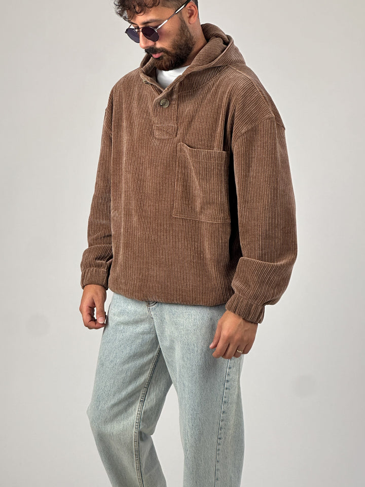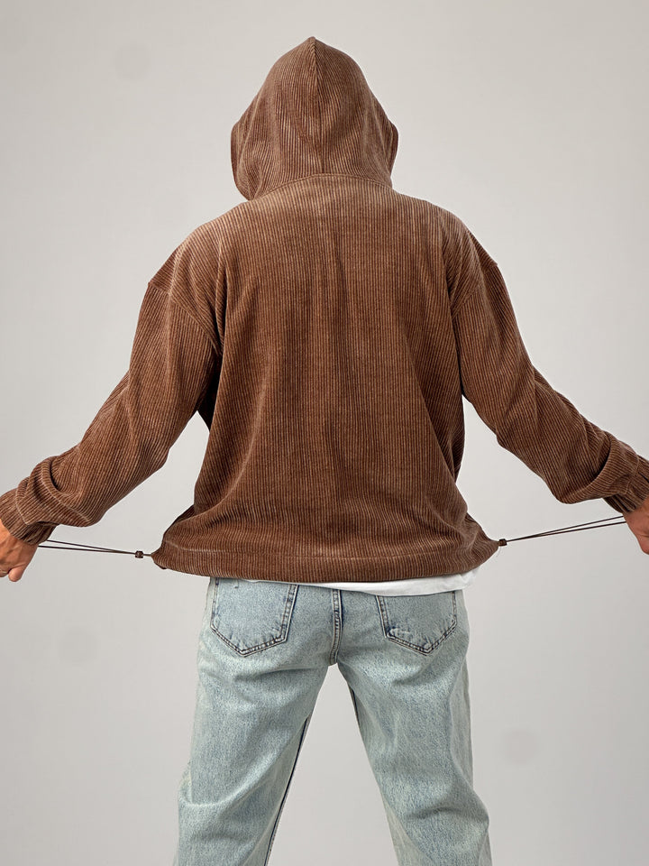Kadife Dokulu Kahve Oversize Kapüşonlu Erkek Sweatshirt