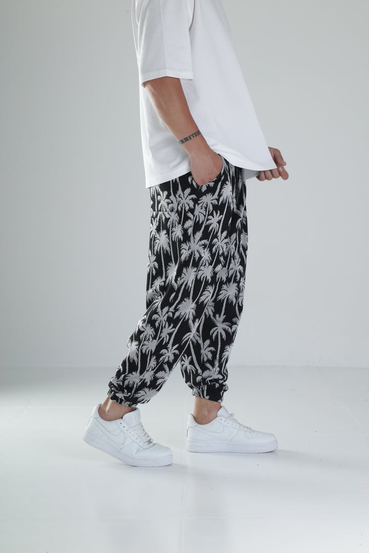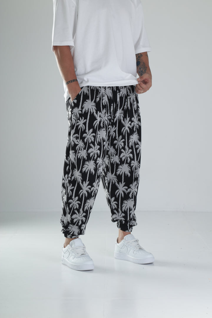Palmiye Desenli Siyah Pileli Jogger